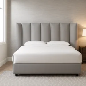 Its clean lines and refined proportions create a luxurious centerpiece that blends modern design with timeless sophistication. Featuring a grand upholstered headboard with sculpted vertical panels, it brings both drama and softness to the bedroom.