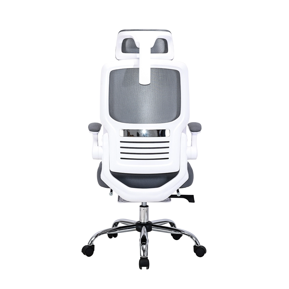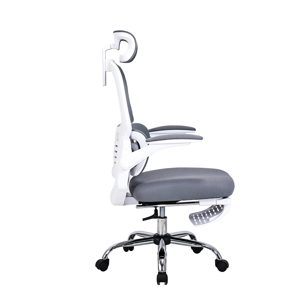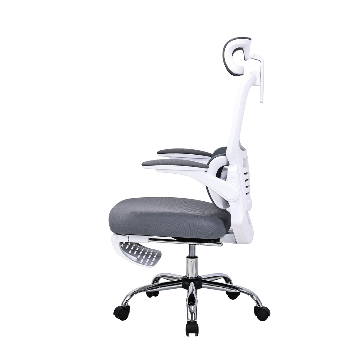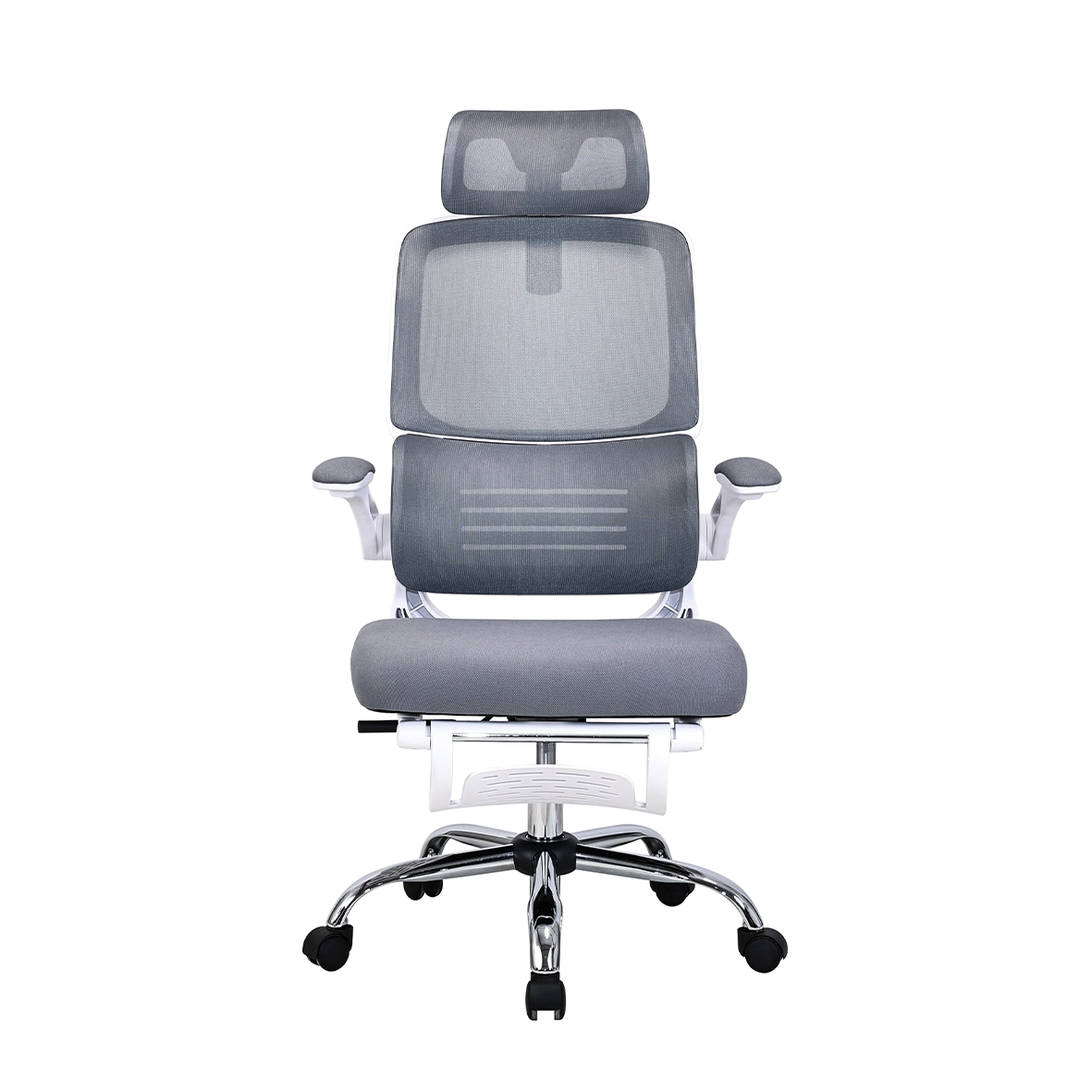 A sleek ergonomic chair designed for all-day comfort, featuring breathable grey mesh, flexible adjustments, and a built-in footrest for effortless relaxation.