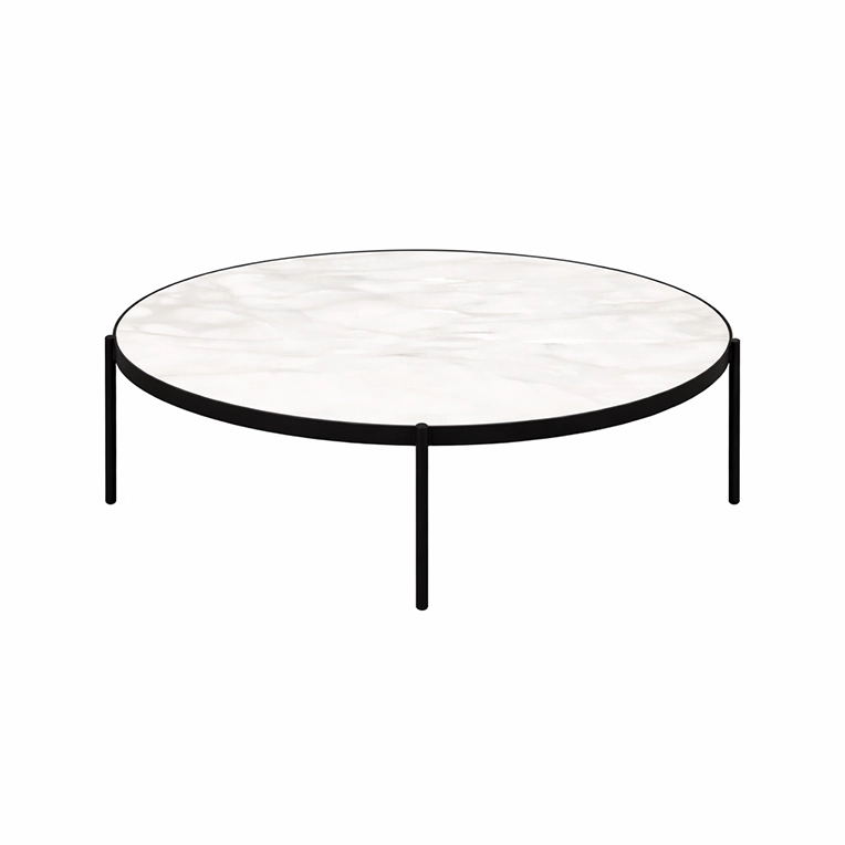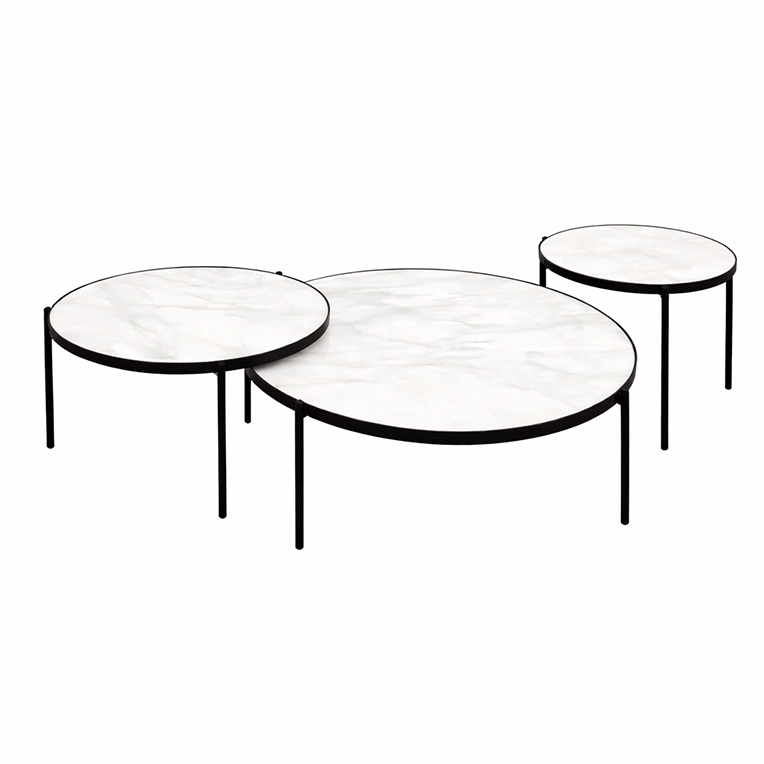• Nesting design set of three round coffee tables, with slim black metal frame.