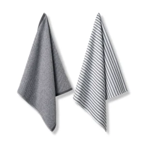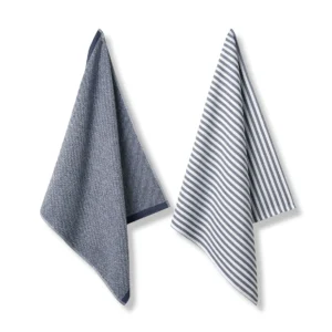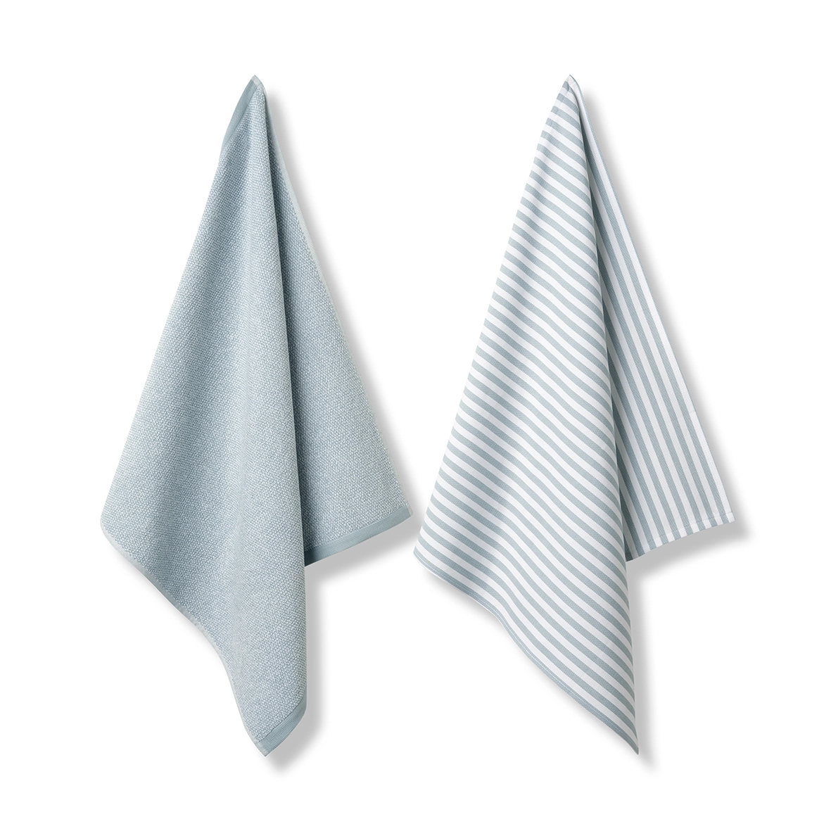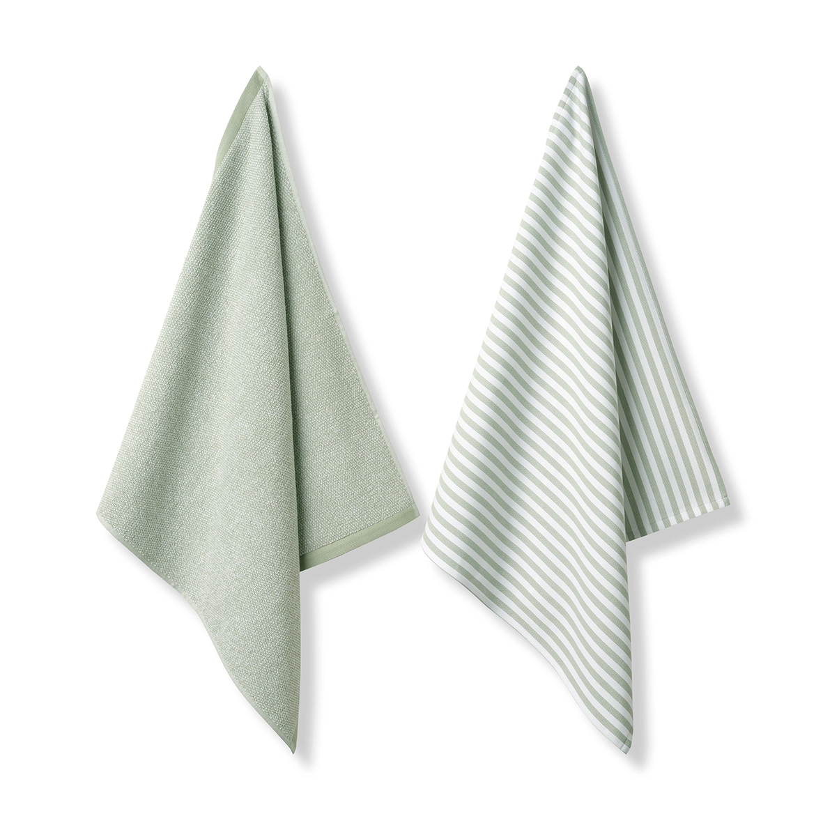 The set includes a striped tea towel and a towel with a muslin pattern, both made of 100% cotton with excellent absorbency. Essential for a complete kitchen setup.
