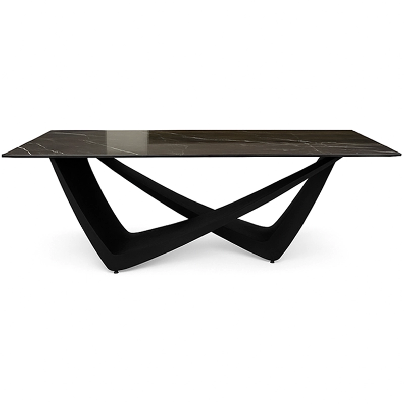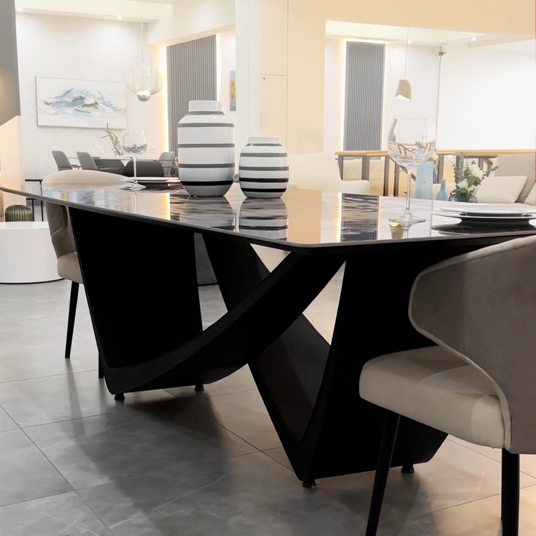 SPEZIA DINING Table refined cross design and luxurious marble top, is a statement timeless modernity, elevating your dining room understated grace.