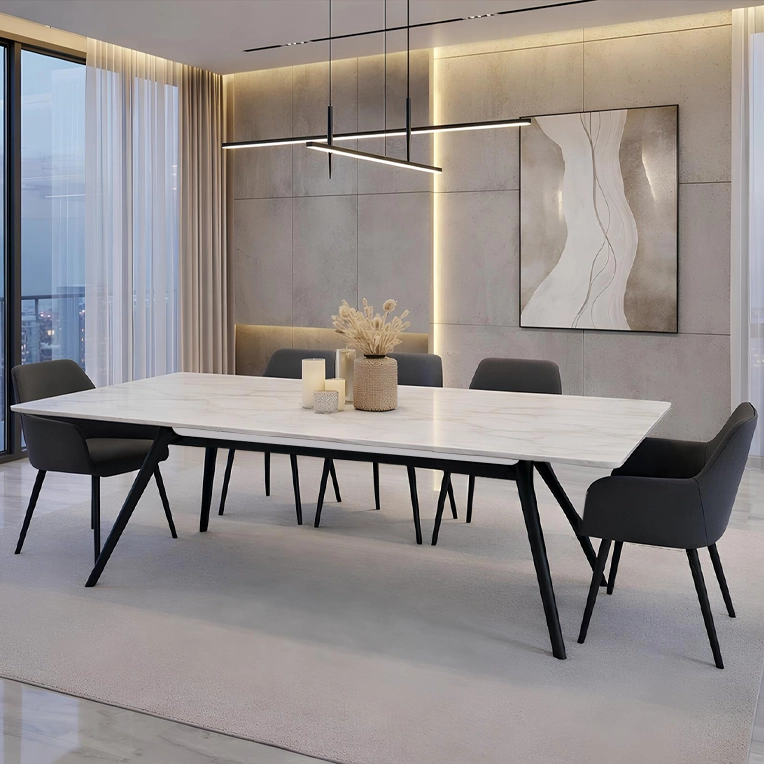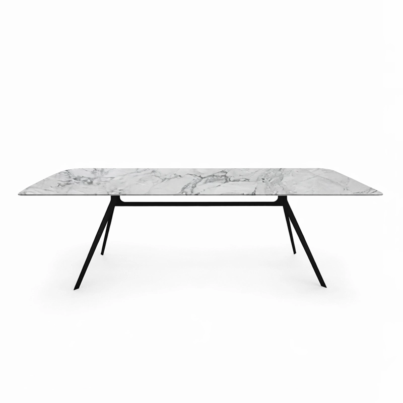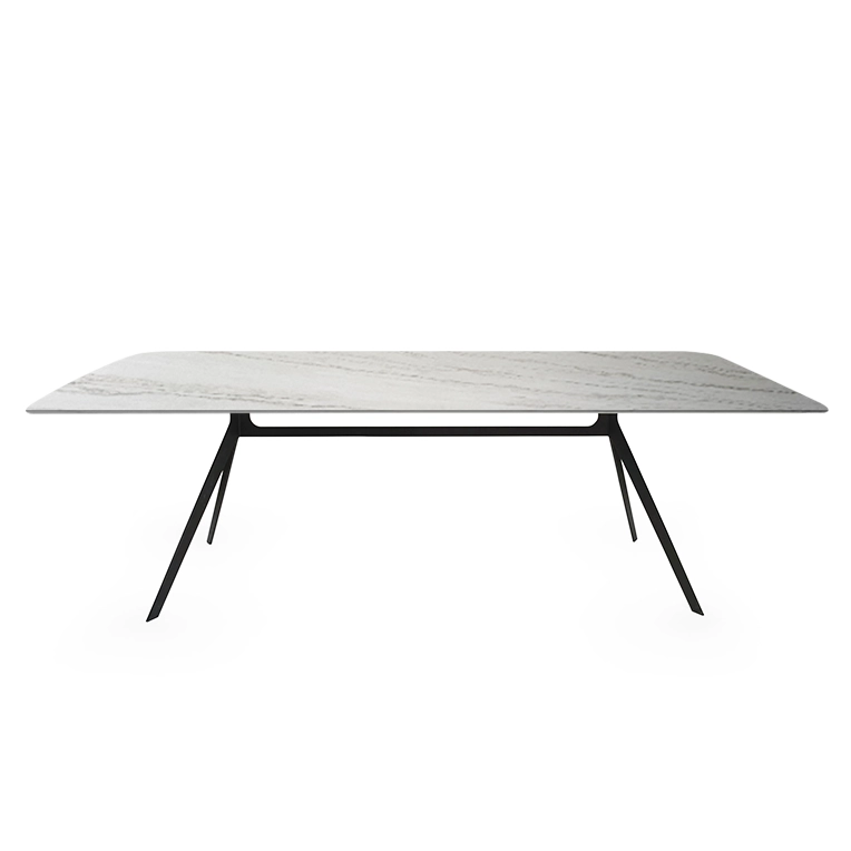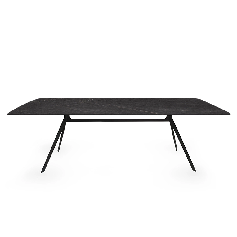The UNO dining table features a sleek top with slanted metal legs for a clean, modern look.